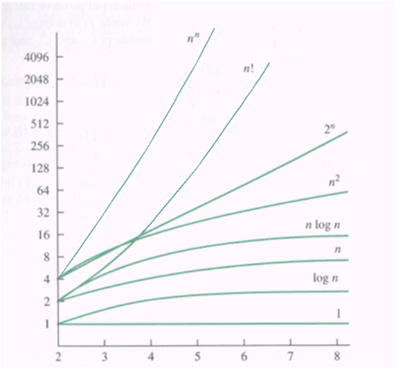حيث نلاحظ أن عمود (n) يزداد أساً عشرياً كل مرة فيما يزداد تابع (n2) أسين عشريين كل مرة، ناهيك عن التوابع الأسرع نمواً كما في الشكل التالي:
