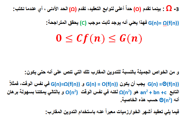 ستسمع بهذه المصطلحات مراراً و تكراراً عند الحديث عن الخوارزميات، فالرموز التي سنتحدث عنها اليوم هي ما ستستمح لك بالتعبير عن فعالية خوارزمية ما من الناحية الزمنية (تعقيدها الزمني) و هو أسلوب رياضي يعتمد على ربط تعقيد الخوارزمية بجحم الدخل … فمثلاً عند البحث عن قيمة ما ضمن مصفوفة (أو مجموعة) من العناصر فستجد هذه القيمة في أسوأ الحالات في نهاية المصفوفة (أو لا تجدها على الإطلاق) و هذا يعني أنه إن كان عدد عناصر المصفوفة (N) عنصراً فسيبلغ تعقيد الخوارزمية الزمني (N) (لأننا نقوم يعملية وحيدة عند كل عنصر و هي المقارنة بين القيمة المطلوبة و قيمة هذا العنصر) أما إن كنا نقوم بطباعة العنصر في كل مرة نقوم بها بالمقارنة فهذا يعني (N) عملية أخرى أي يصبح تعقيد الخوارزمية (2N) .. لكن هذا الثابت لا يعني شيئاً في مجال التدوين المقارب الذي يقارب تابع التعقيد بتابع بسيط و لها ثلاثة تعابير رئيسية:
