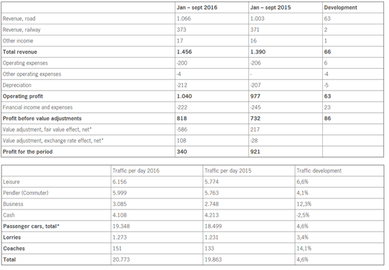 نلاحظ زيادة قوية لإيرادات التنقلات المرورية عبر جسر أوريسند بنسبة 4.6% للفترة بين يناير إلى سبتمبر 2016، حيث أن الإيرادات الكلية 818 مليون كرونة دنماركية، ثم من بعد زادت بواقع 86 مليون كرونة دنماركية.