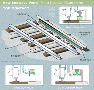 ويتم تسيير القطارات بالاعتماد على الكابلات المعلقة، أو القضيب المكهرب المعروف بالقضيب الثالث، ويكون على أحد جانبي أو بين قضيبي مسار القطر، وتقوم النواقل الموجودة أسفل عربة القطار، بنقل الطاقة من القضيب للموتور الكهربي، في نيويورك مثلًا؛ يحمل القضيب الثالث (625) فولت، وتحتاج القضبان والكابلات لمحطات توليد الكهرباء لمدها بالطاقة، ويقوم عدد من الكابلات والمحطات بنقل الكهرباء من محطات التوليد الرئيسية للقضبان، ففي مترو القاهرة يغذي خطوط مترو الأنفاق الثلاثة 4 محطات كهرباء، بينهم محطتان للخط الأول، ومحطتان لكلٍّ من الخطين الثاني والثالث، حيث يعتمد مترو الأنفاق في تسيير حركة قطارات على هذه المحطات، ويعتمد الخط الأول على محطتي كهرباء أحدهما محطة طرة البلد، والأخرى هي محطة كهرباء رمسيس، فيما يغذى الخط الثاني محطة كهرباء برمسيس، ويغذي الخط الثالث محطة كهرباء بالعباسية.