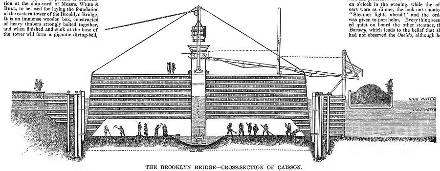 أثناء هذا العمل كان مُعرَّضًا في أي وقت حدوث خللٍ في الضغط وانهيار الحجرات فوق العمال، لكن العمل تحت تأثير الضغط الكبير أدَّى إلى إصابة بعضهم بالأمراض، واستمر العمل لمدة خمسة أشهر واجه خلالها مشاكل الأحجار الكبيرة أثناء هبوط الحجرات، ولكن تغلب عليها عن طريق تفجيرها، ومشاكل الحريق الذي نشب في سقف الحجرات، مما دفعهم لغمر الحجرات بالمياه، وهذا كَلّفَهم 9 أسابيع إضافية للوصول للقاع الصخري في بروكلين، والذي بلغ عمق الأساسات فيه 13مترًا.