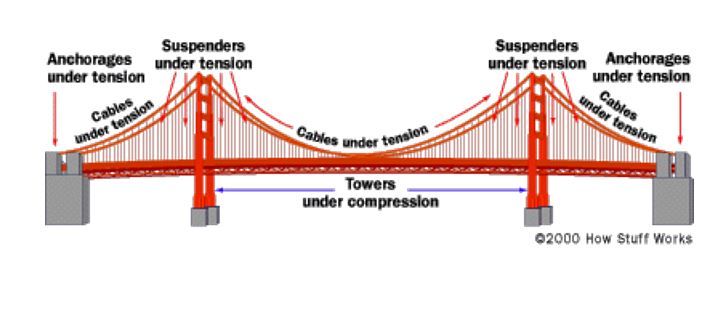 إذا نظرنا للجسر نجد أنه ليس فقط الظروف الصعبة التي تم بناؤه فيها هي ما جعلته عملًا رائعًا، ولكن أيضًا البنية الإنشائية التي أوجدت هذا الشكل الجمالي. فشكل الكابلات على هيئة قطعٍ مكافئ نتج عن الحِمل المُنتظم الواقع عليها، وجَعْل الحمل منتظمًا يتم بوضع منشأ ثانوي يُسمَّى (جمالون داعم –stiffening truss) على كمرات عرضية، وظيفته هي توزيع الحمل بطريقة جانبية للخارج، حتى يتم توزيع أي حمل على جميع الكابلات الثانوية بالتساوي، ثم تمتد الكابلات وصولًا لأعلى البرج فتصبح مُنحنية، ونتيجةً لذلك يتحول كل الشد في الكابلات لأسفل خلال الأبراج على شكل قوى ضغط تنتقل عبر (العقود –arches) بشكلٍ دائري حول فتحات عبور السيارات حتى وصوله للأساسات. فالأبراج تحمل وزن الكوبري بشكلٍ كامل وكافة الأحمال المارة عليه، فهي تقوم بوظيفة الأعمدة.