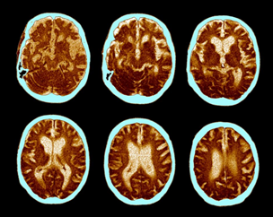 صورة (1): يظهر مسح الدماغ لمرضى ألزهايمر فقدانًا تدريجيًا في خلايا الدماغ، ويحدث ذلك بسبب ترسب بروتين غير طبيعي في الدماغ، والذي بدوره يقتل الخلايا العصبية ويتسبب في ضمور المخ.